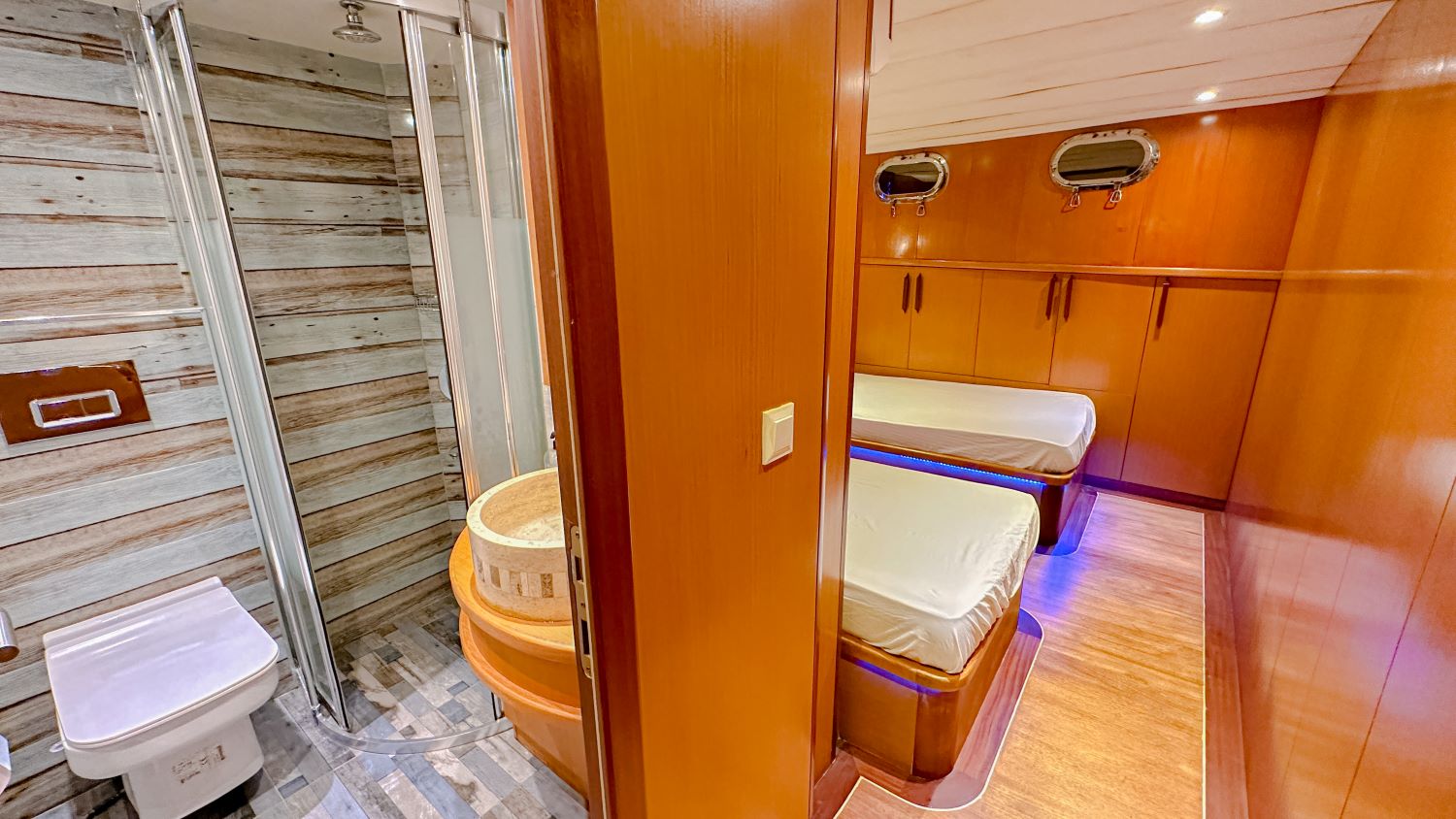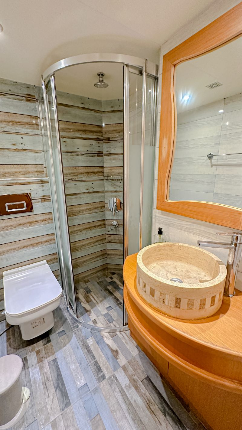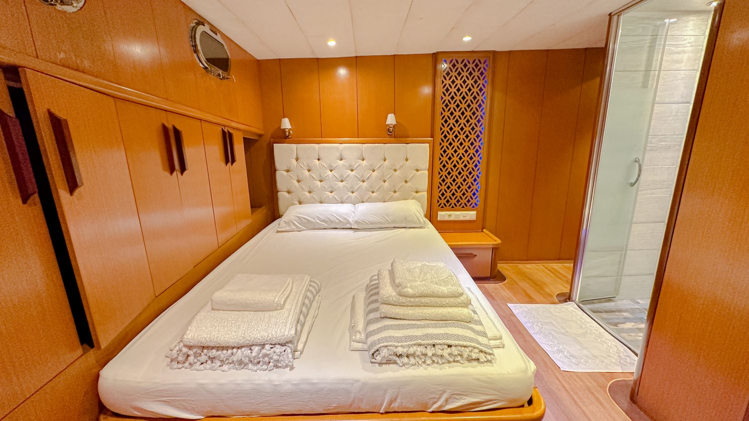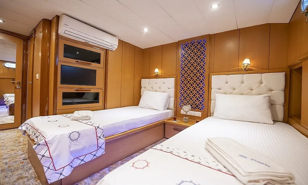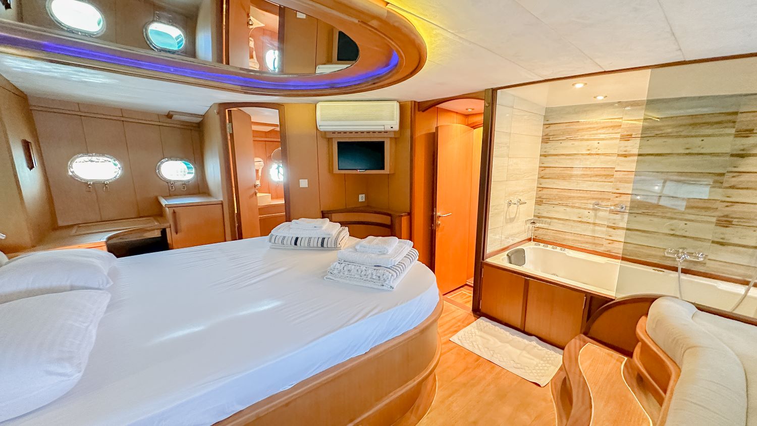 Luxury Blu Dream is perfect for private charters along Turkey’s coastlines. Offering a blend of modern comfort and spacious accommodation, its 4 cabins provide flexible options for up to 10 guests. Each cabin features its own shower and toilet, ensuring privacy and convenience. Our guests will be accomodated in 1 spacious master cabin that includes a jacuzzi, a smaller comfy master cabin and 2 large twin cabins convertable in double or triple.