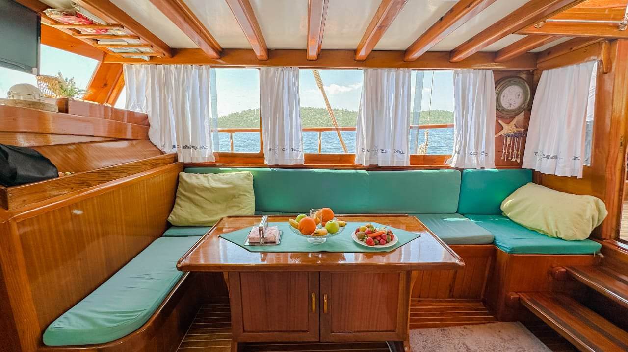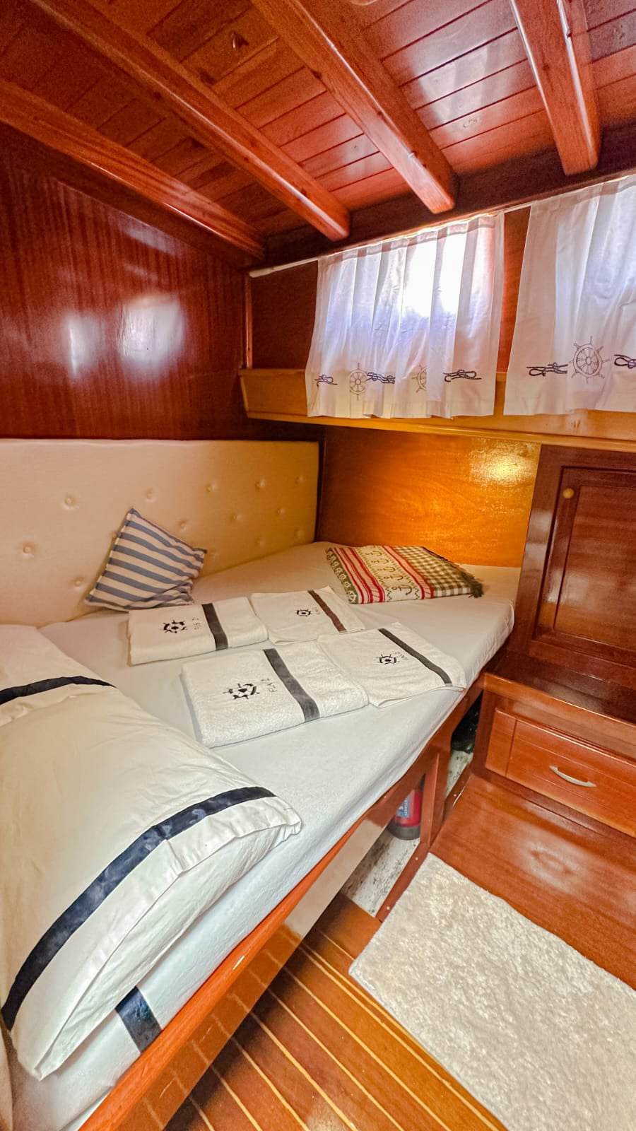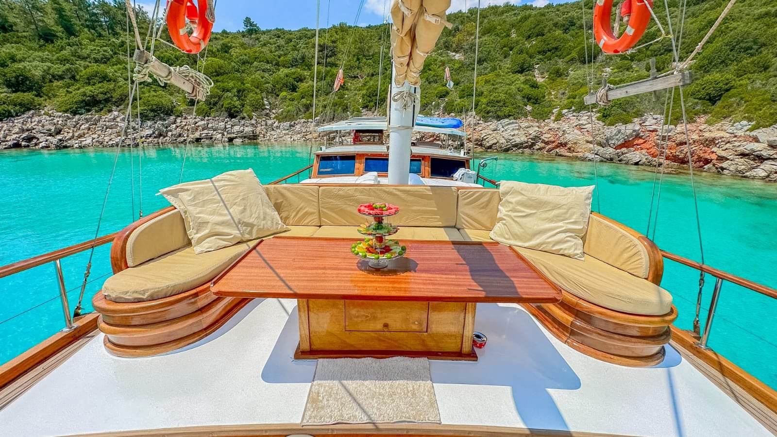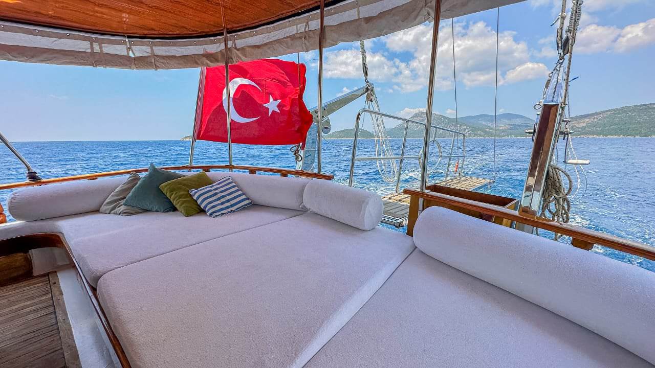 The Flas2 gulet offers a welcoming family atmosphere for guests seeking an authentic gulet experience. The aft lounge area is large anf comfy, and the indoor saloon provides a relaxing space to unwind. With its layout focused on comfort, the gulet Flas2 is ideal for families, friends, or groups looking for a memorable voyage. Guests can enjoy water sports, explore hidden bays, or simply relax under the sun as the gulet cruises through picturesque routes departing from its base in Bodrum Sea Garden ( located 20 min out of Bodrum town).