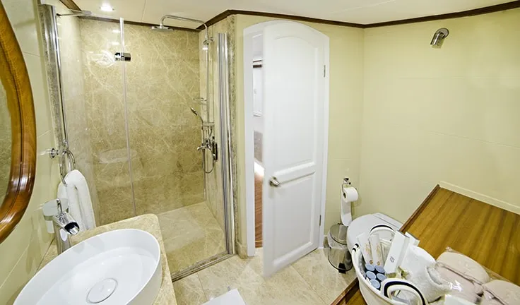 The accommodation includes 2 spacious master cabins and 4 elegant double cabins, all decorated in stylish grey-blue tones and featuring private en-suite bathrooms, individual air conditioning, TV, and music systems. Every detail has been designed to ensure privacy, comfort, and relaxation throughout your cruise.