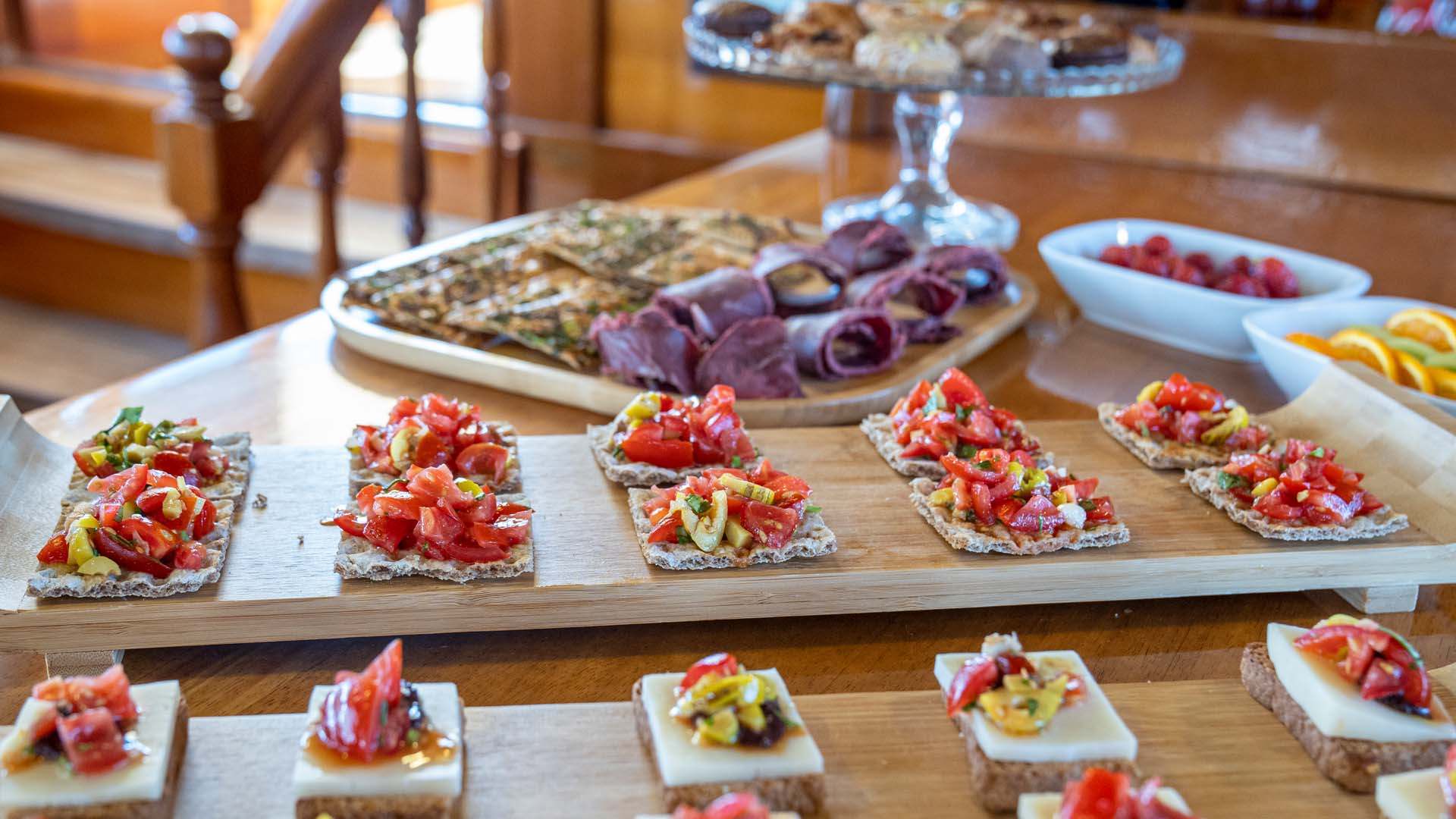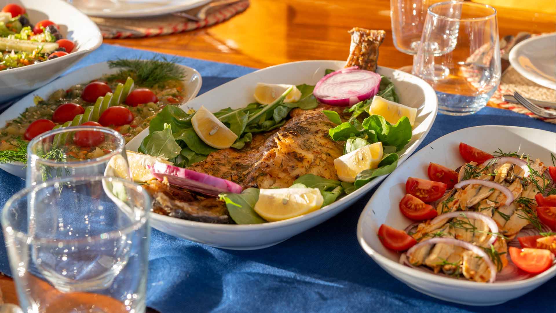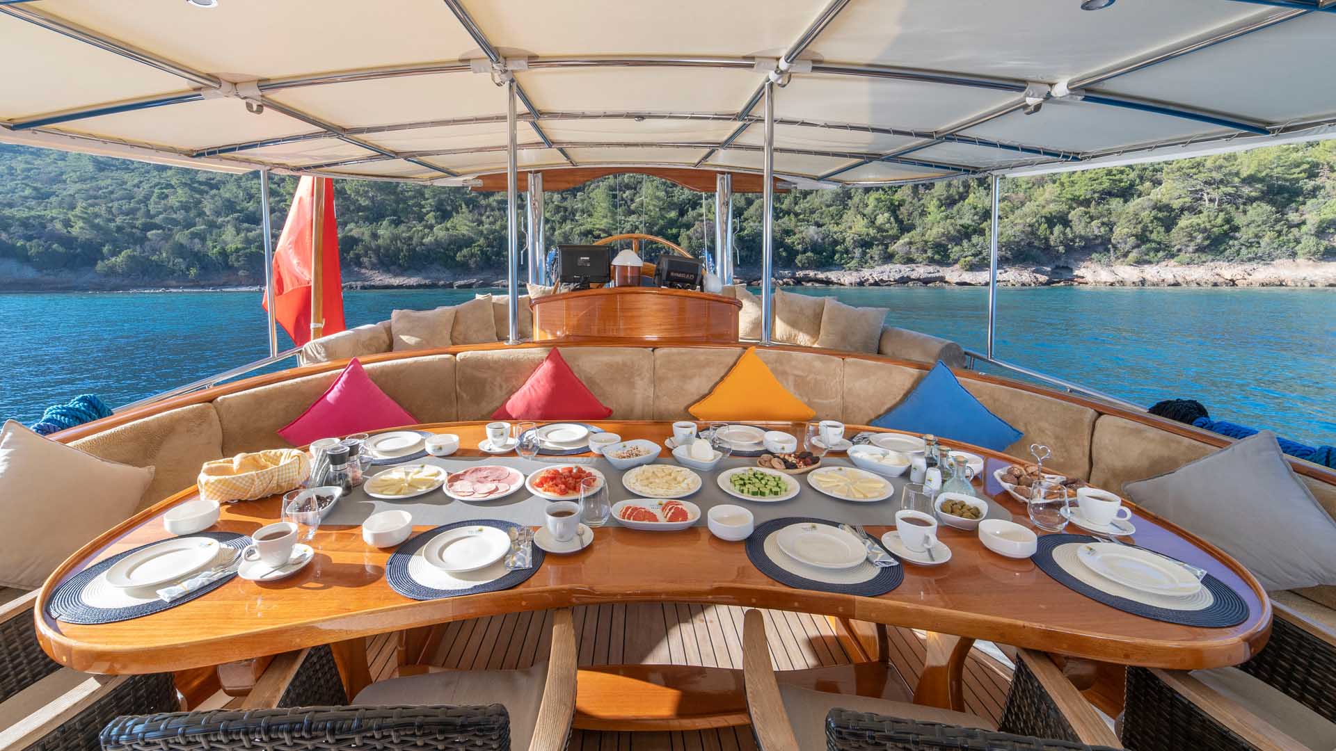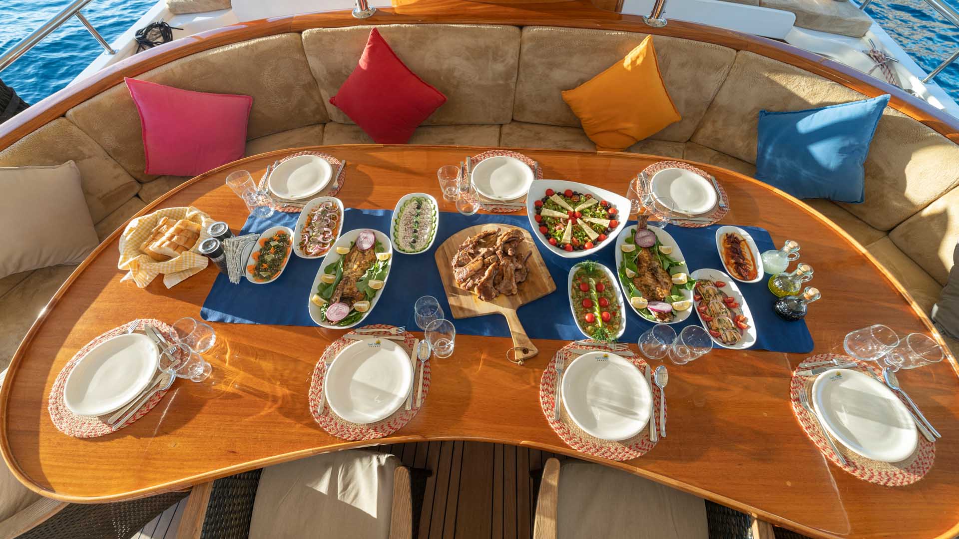 Meals are freshly prepared on board by the chef and are a key part of the Blue Cruise experience. The cuisine is Mediterranean and Turkish-inspired, using seasonal and local ingredients.