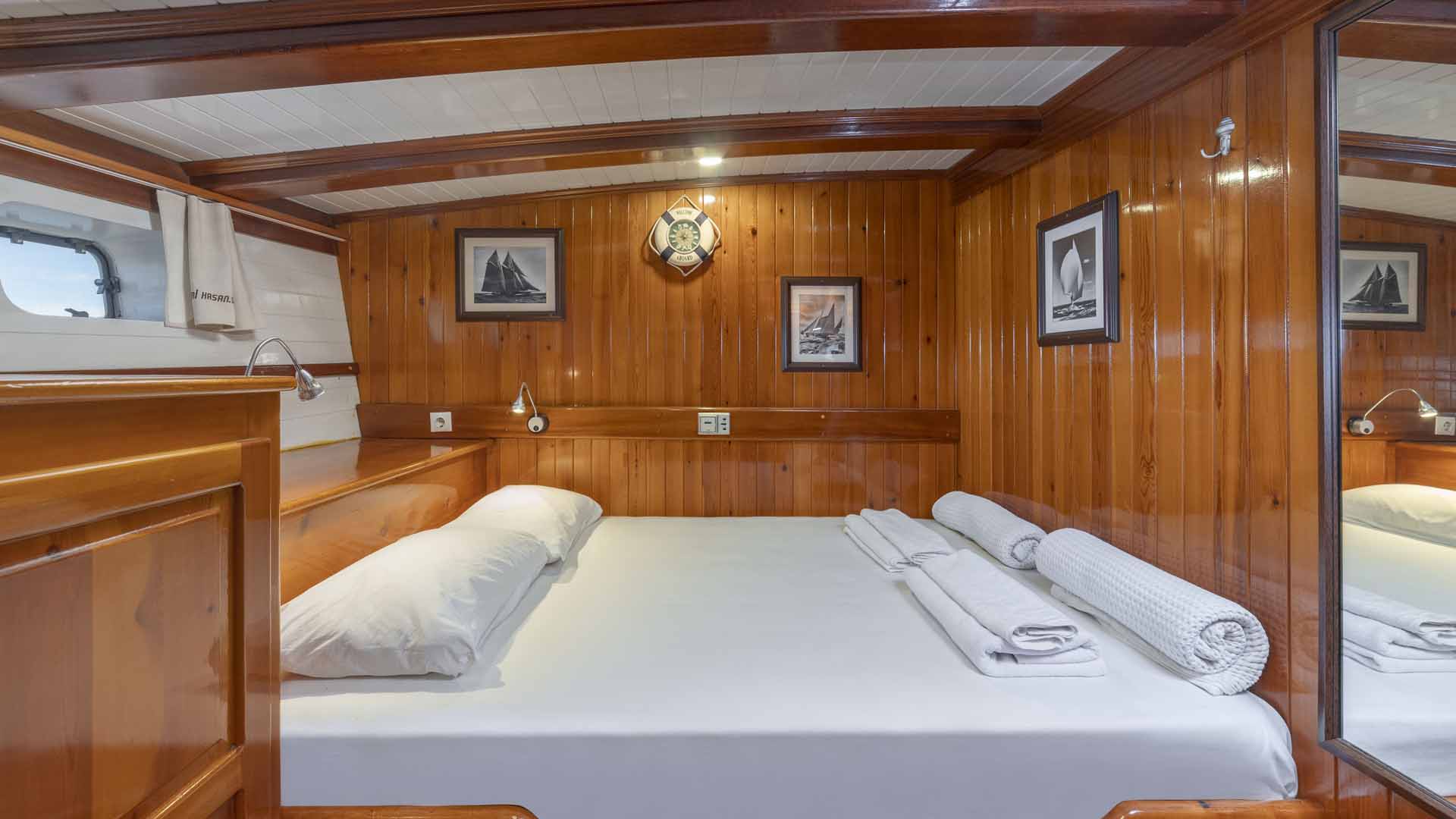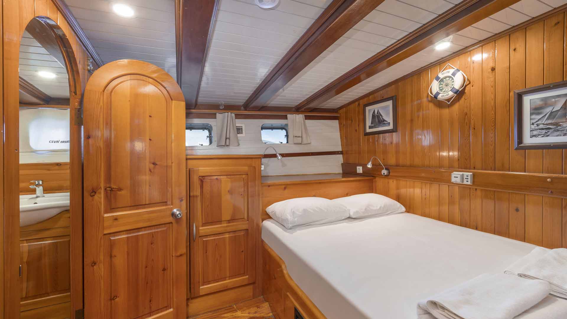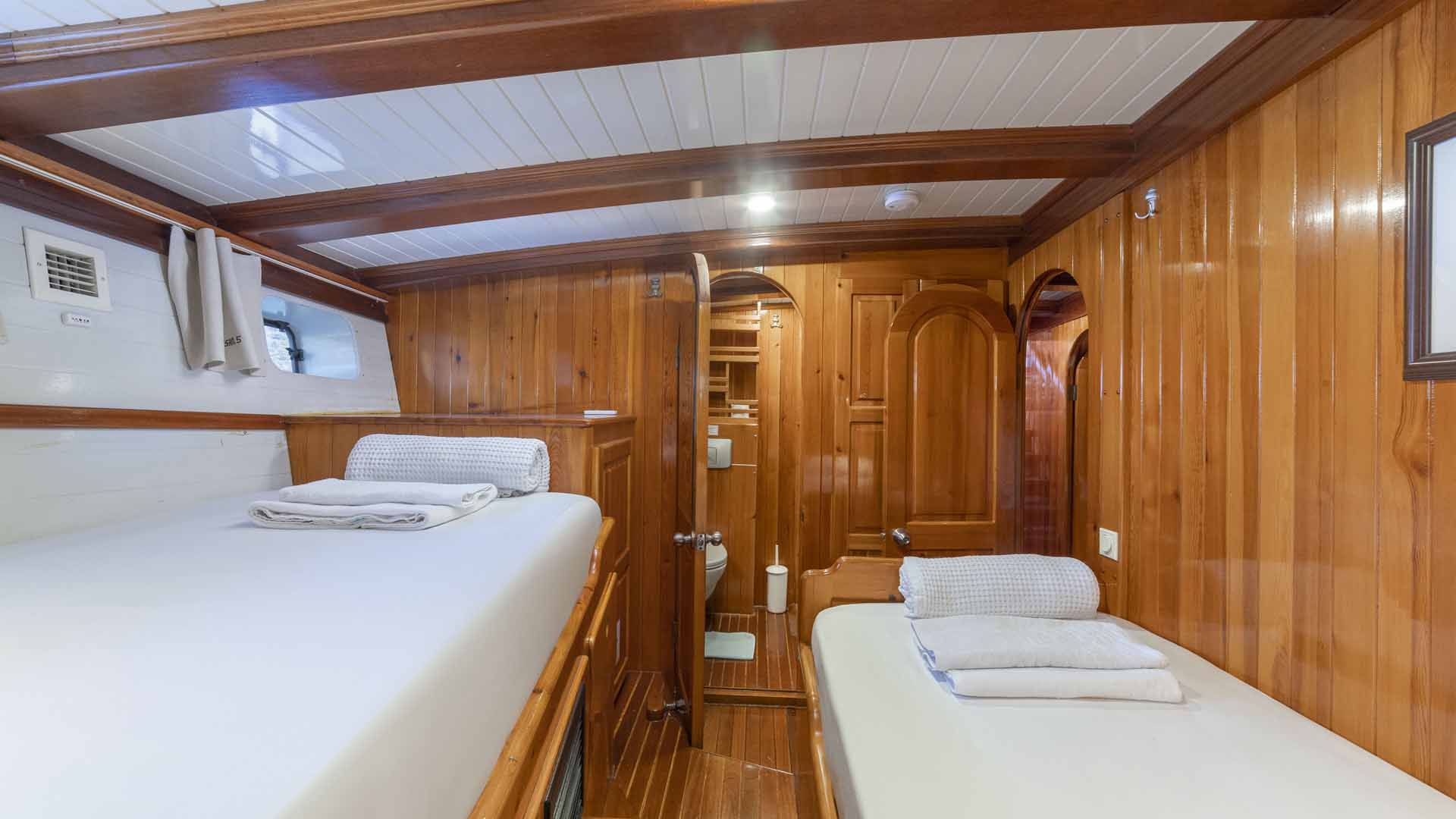 Cevri Hasan 5 is approximately 29 meters long and accommodates up to 12 guests in 6 guest cabins. The cabin layout includes a mix of double, twin, and triple cabins, making the yacht flexible for different group compositions.