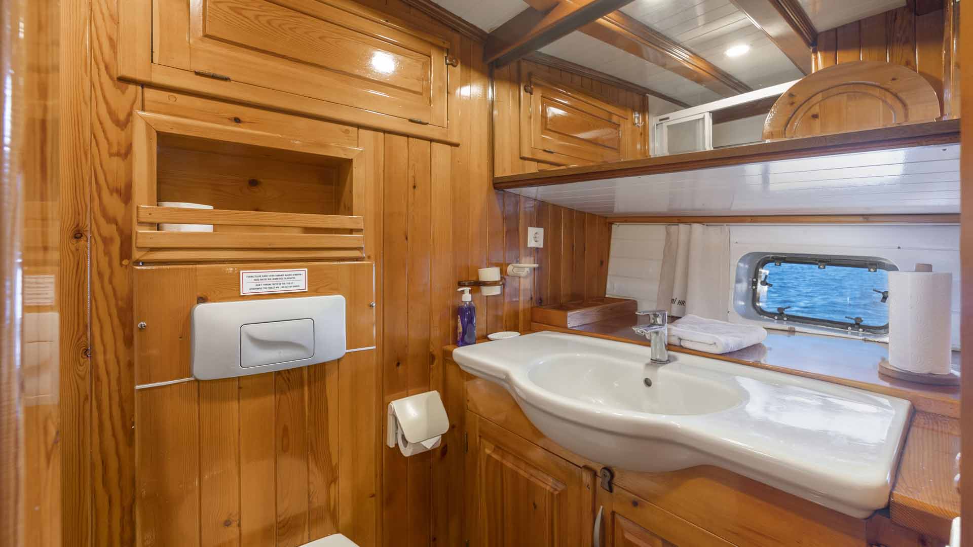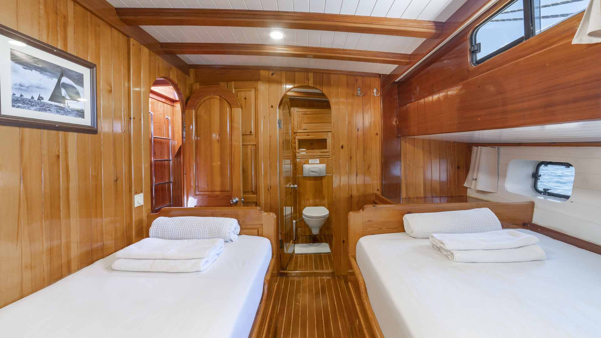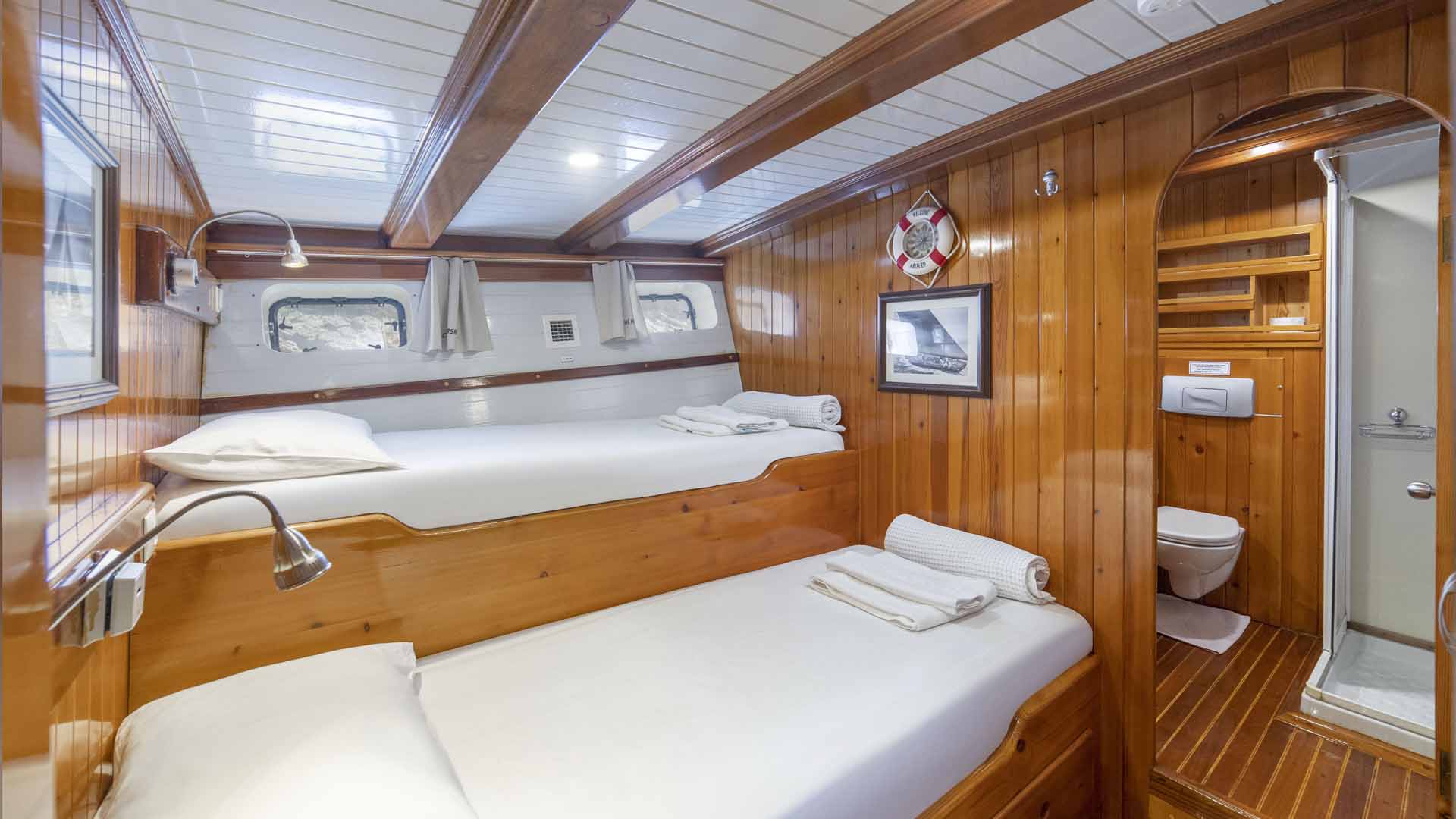 Cevri Hasan 5 is approximately 29 meters long and accommodates up to 12 guests in 6 guest cabins. The cabin layout includes a mix of double, twin, and triple cabins, making the yacht flexible for different group compositions.