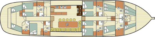 All cabins are air-conditioned and feature private en-suite bathrooms with shower and WC.