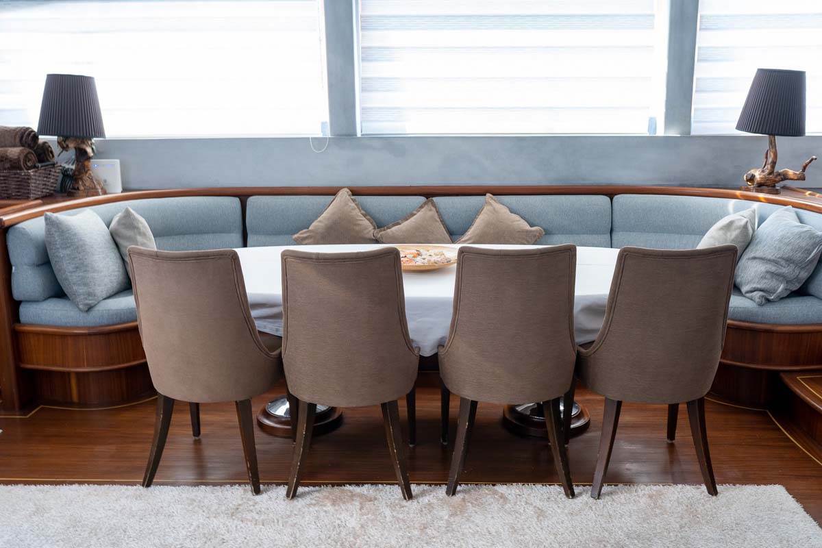 Completamente climatizzato, include un ampio salone interno ed esterno con home theatre per il vostro intrattenimento. Il ponte di poppa ospita un grande tavolo da pranzo e morbidi cuscini per cenare e rilassarsi. Il ponte anteriore ha 12 comodi lettini prendisole attorno alla vasca idromassaggio. Mentre per le serate a bordo la zona migliore è la spaziosa e grande fly bride; ideale per un aperitivo al tramonto.