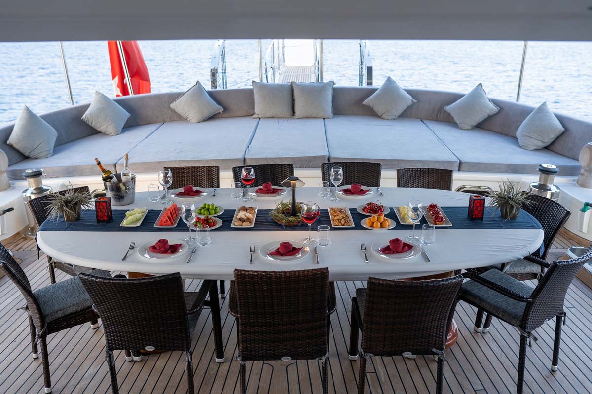 I pasti a bordo sono un punto forte preparati ogni giorno dal nostro chef di bordo. Il nostro menu di lusso a pensione completa include pesce fresco, carni, insalate e frutta su misura per le preferenze degli ospiti, introducendo allo stesso tempo i nostri ospiti anche alla cucina turca locale.