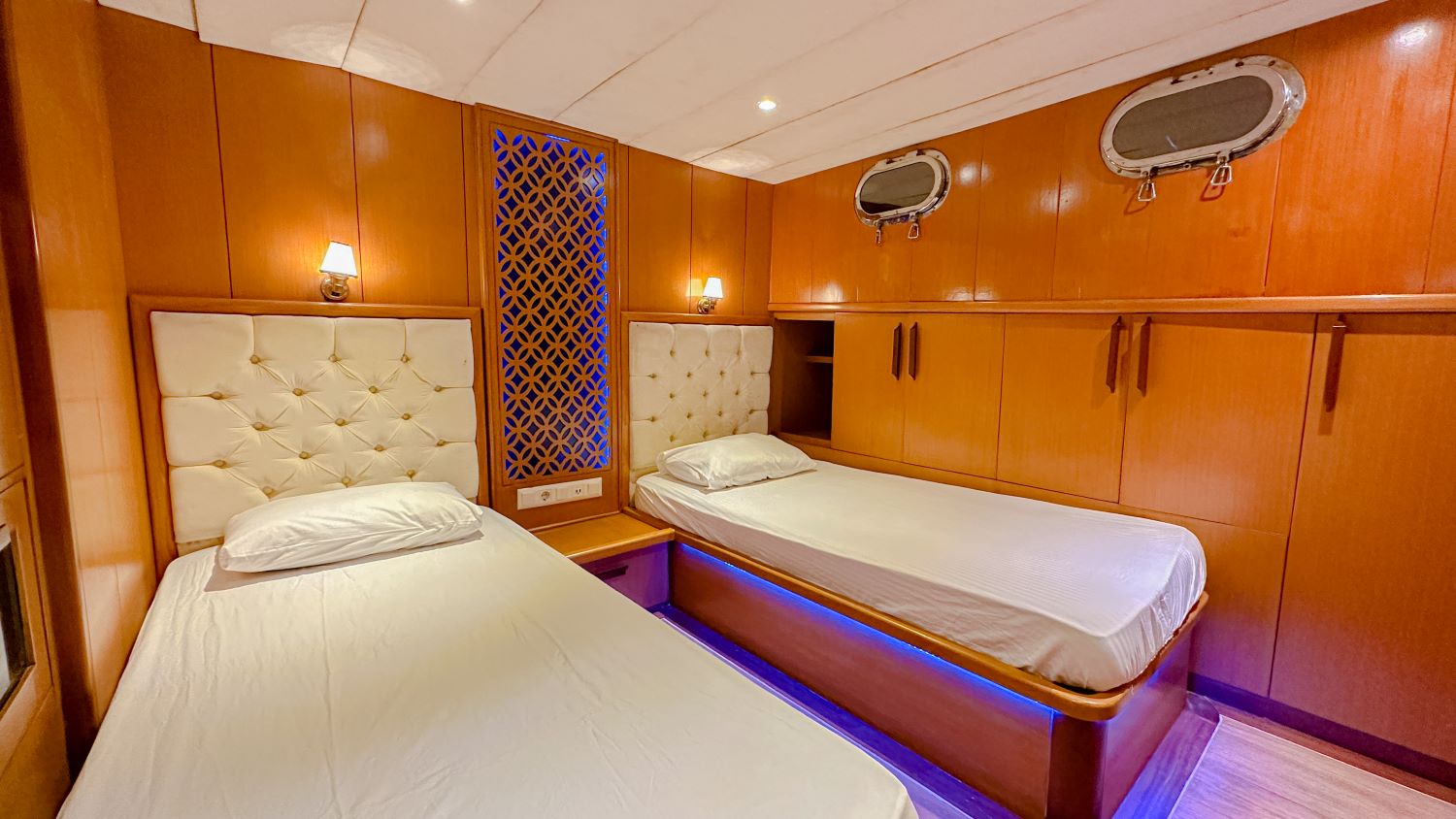 I nostri ospiti saranno sistemati in una spaziosa cabina armatoriale che include una jacuzzi. Potranno scegliere anche la cabina armatoriale più piccola e comfortevole oppure le 2 ampie cabine doppie convertibili in doppie o triple. Tutte le cabine hanno l’aria condizionata che può essere accesa per circa 8 ore di notte.