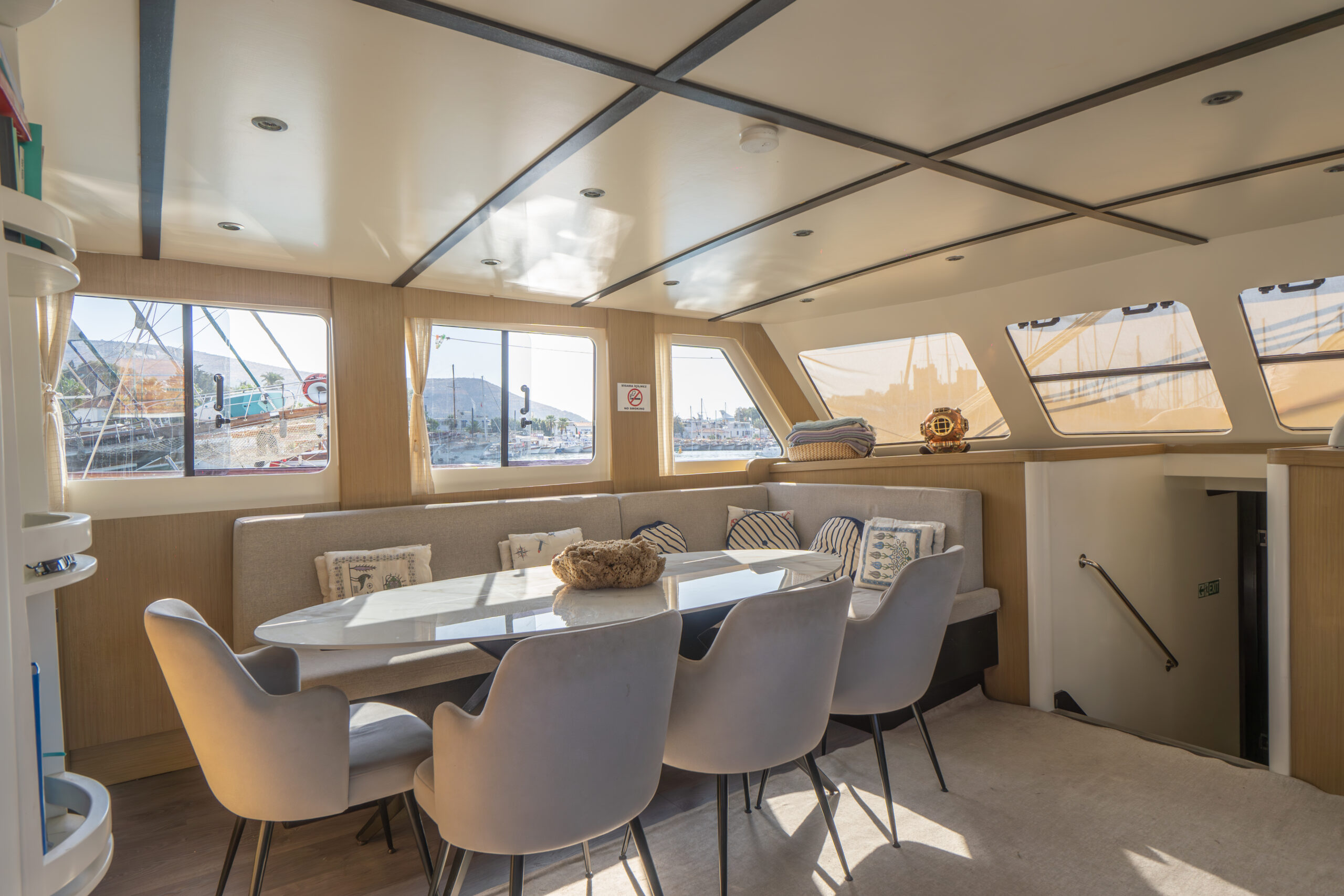 L’ampio ampio salone esterno con larga cusciniera come anche i lettini prendosole saranno perfetti per rilassarsi al ombra o al sole. I pasti a bordo sono un’esperienza a parte. Con un menù di pensione completa ricco di pesce, carne e prodotti freschi. Puoi avere più info in merito al menu e bar in caicco qui.