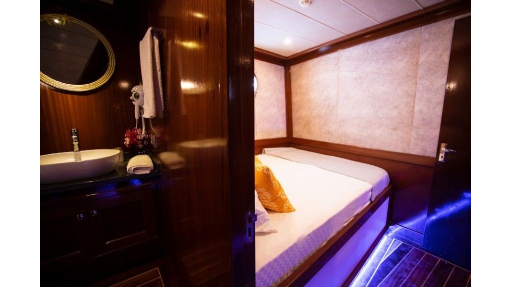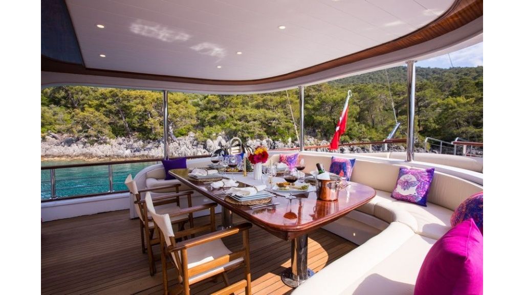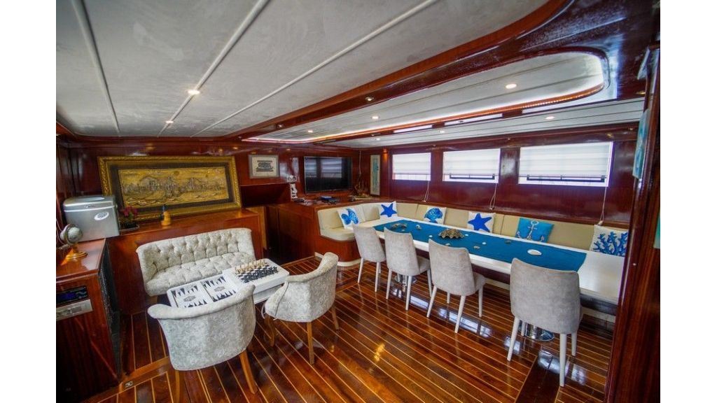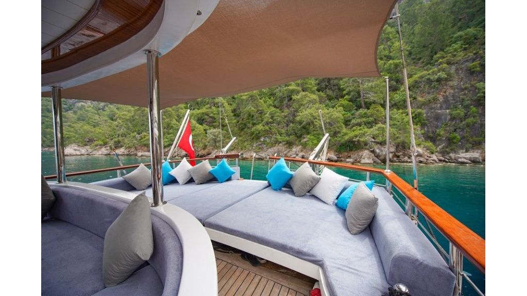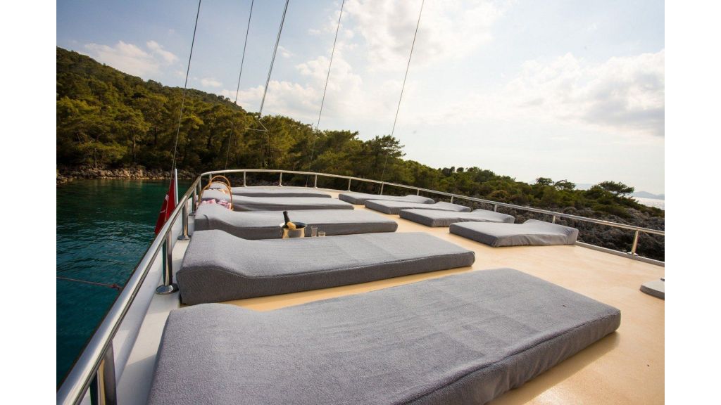 Completamente climatizzato, comprende un ampio salone interno ed esterno. Al esterno ci sono spazi con morbidi cuscini, ponte ombreggiato per cenare e rilassarsi e un ampio prendisole. Gli ospiti possono praticare una varietà di sport acquatici, tra cui snorkeling, sci nautico, wakeboard, paddle e kayak. Insieme al ampio sunbridge, jacuzzi e open cinema rendendono questo caicco un’opzione eccellente per un’esperienza memorabile.