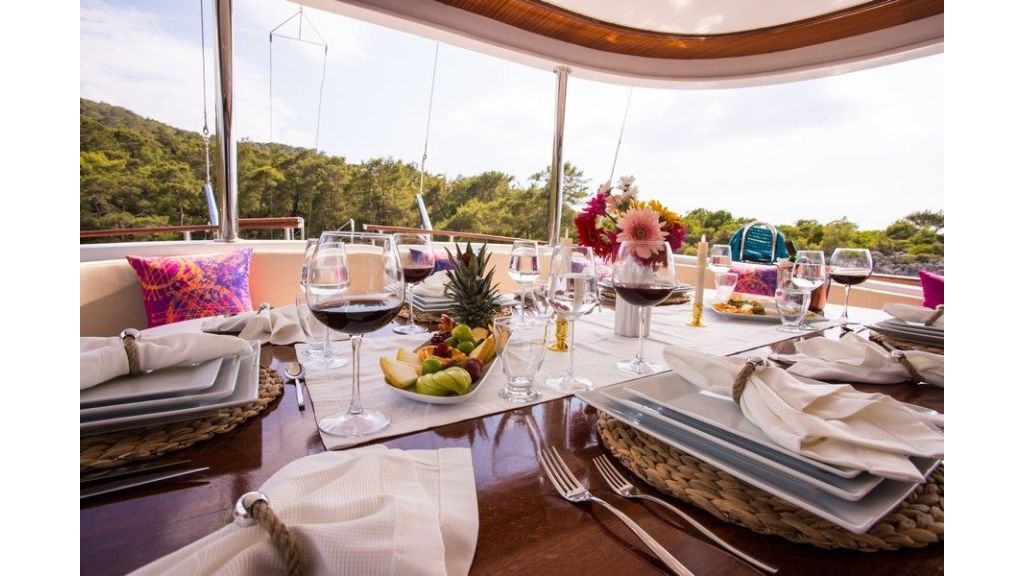 Il menu organizzato secondo le vostre preferenze è di pensione completa includendo i sapori della cucina turca e internazione preparati giornalmenet dal nostro chef a bordo.