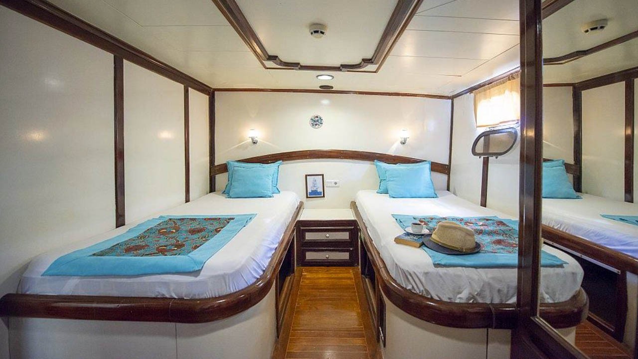 Le cabine a bordo sono comode e ampie. In poppa si sono 4 cabine come anche in prua divise tra doppie e twin. Tutte le cabine hanno il bagno con box doccia. Il caicco ha l’aria condizionata in funzione circa 8 ore al giorno.