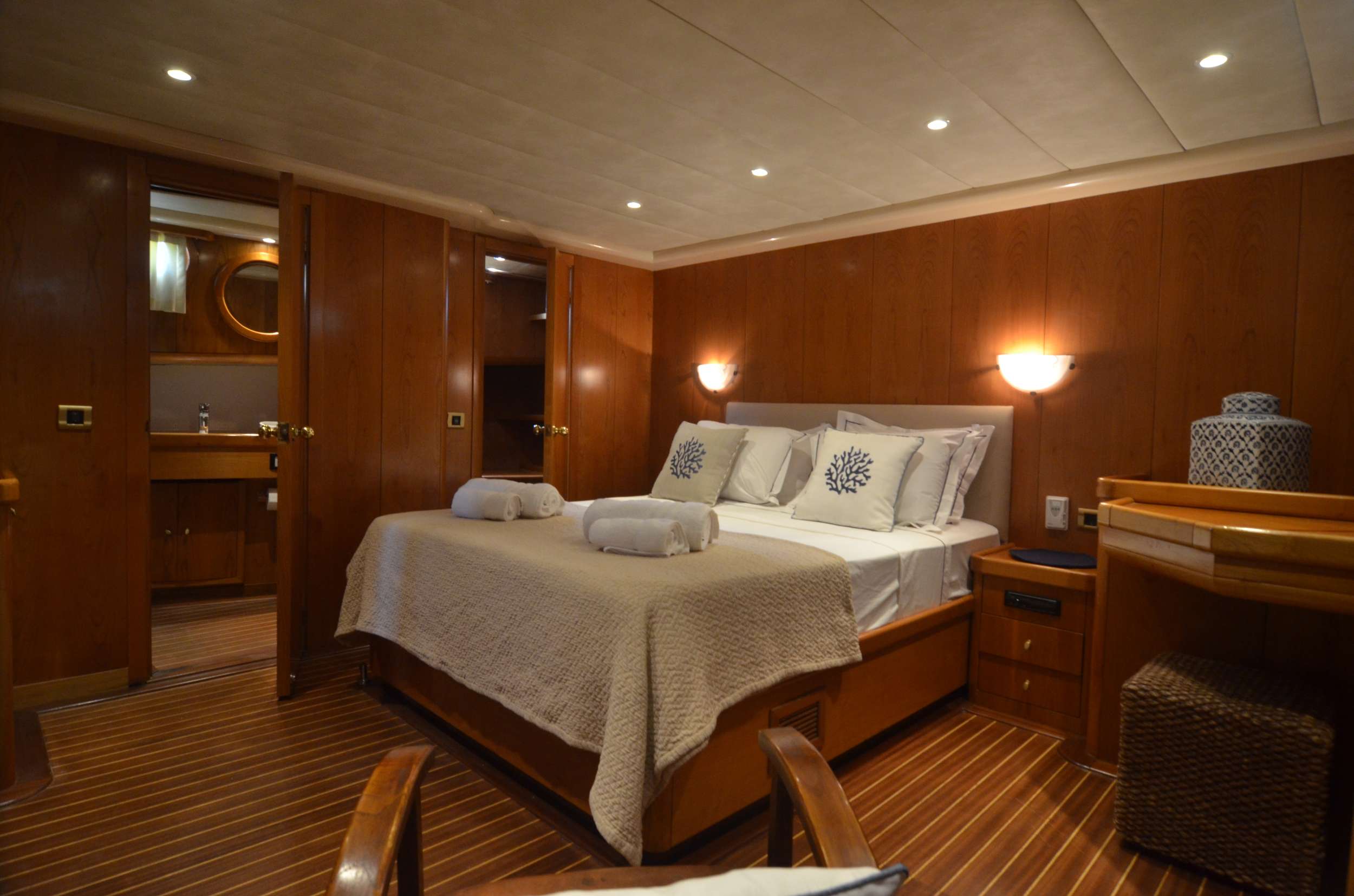 Completamente climatizzato, include un ampio salone interno ed esterno con home theatre per il vostro intrattenimento. Il ponte di poppa ospita un grande tavolo da pranzo e morbidi cuscini per cenare e rilassarsi. Il ponte anteriore ha comodi lettini prendisole.
