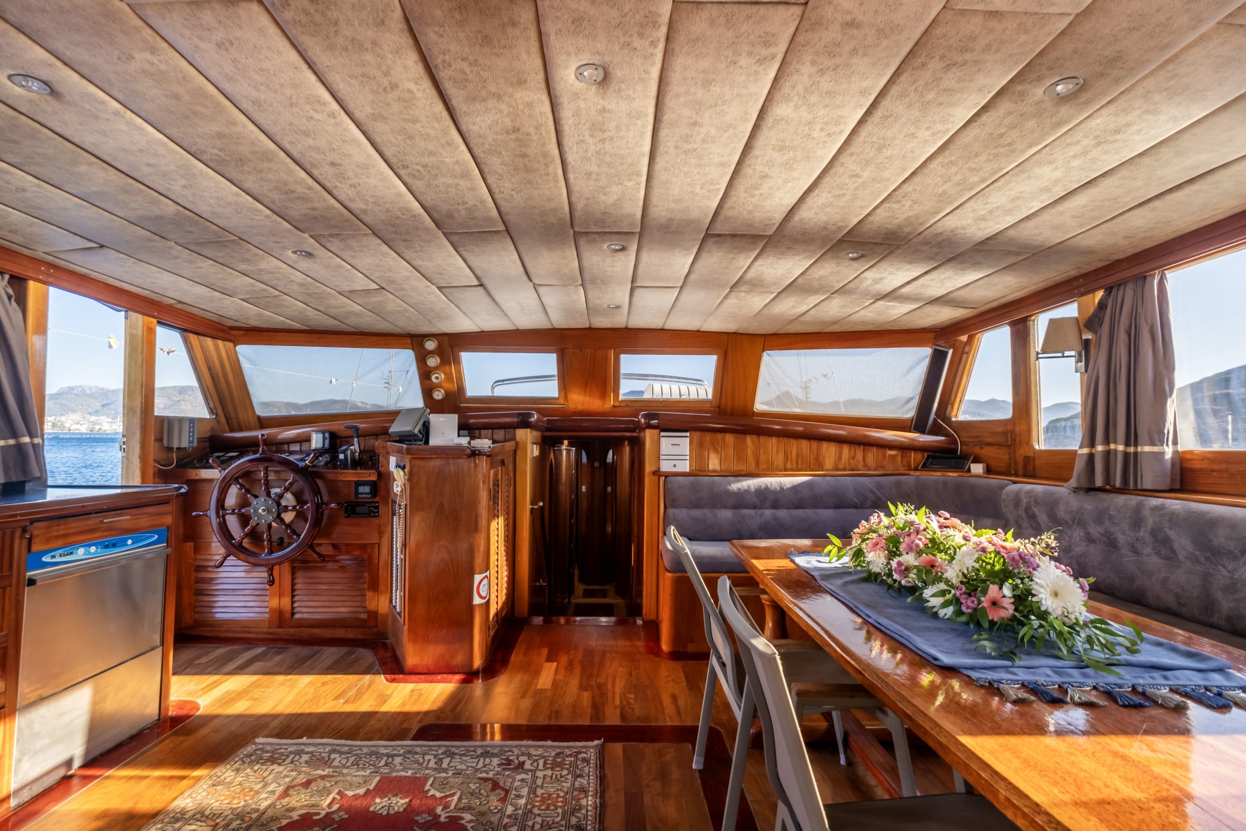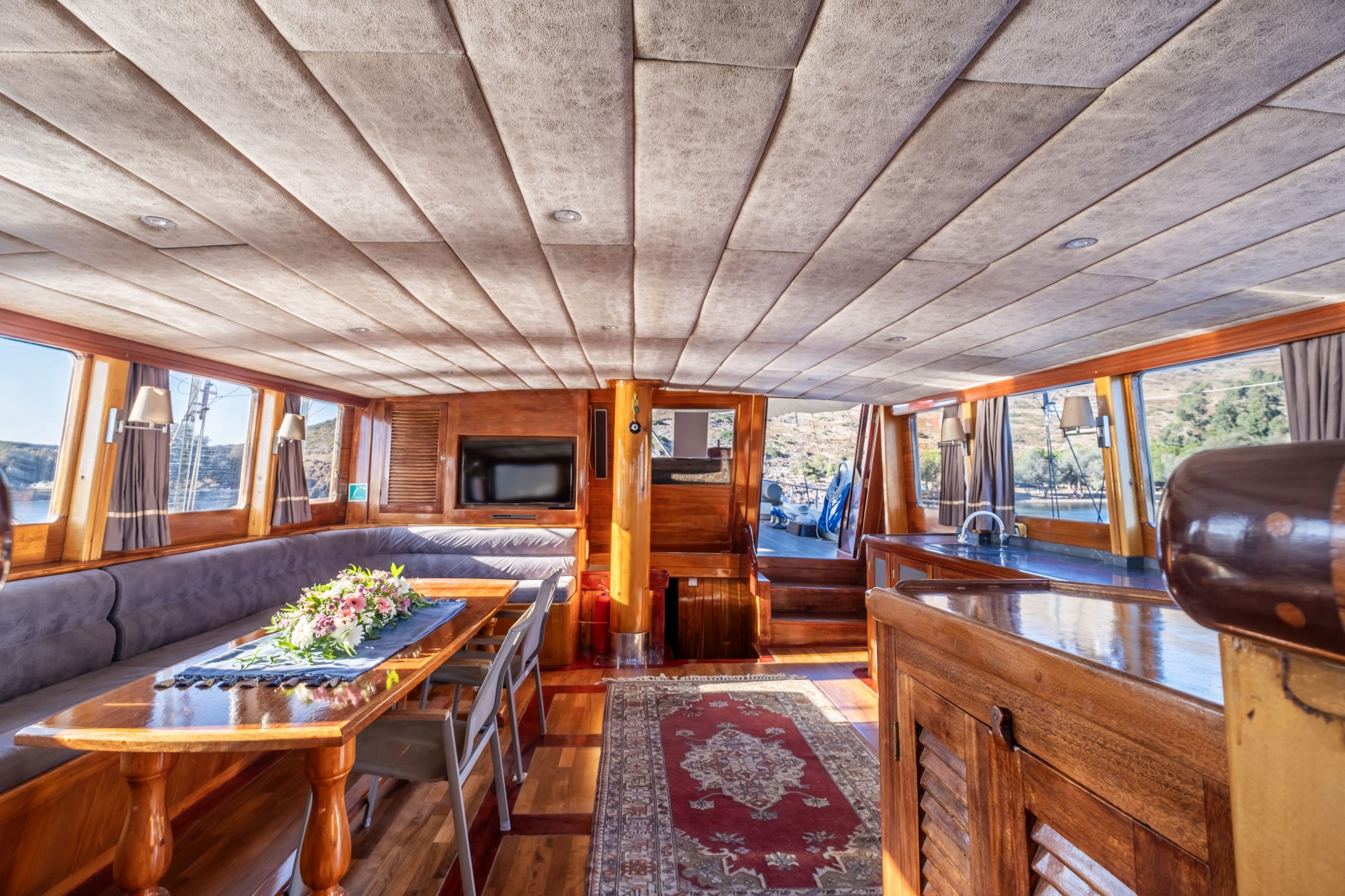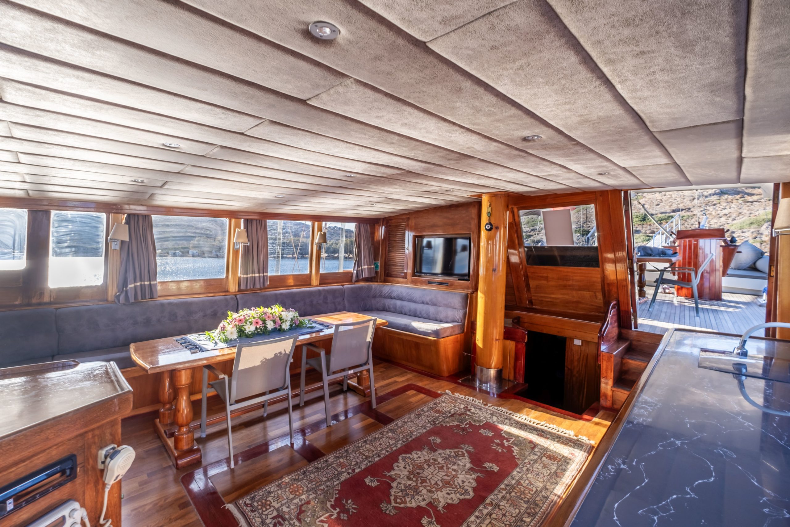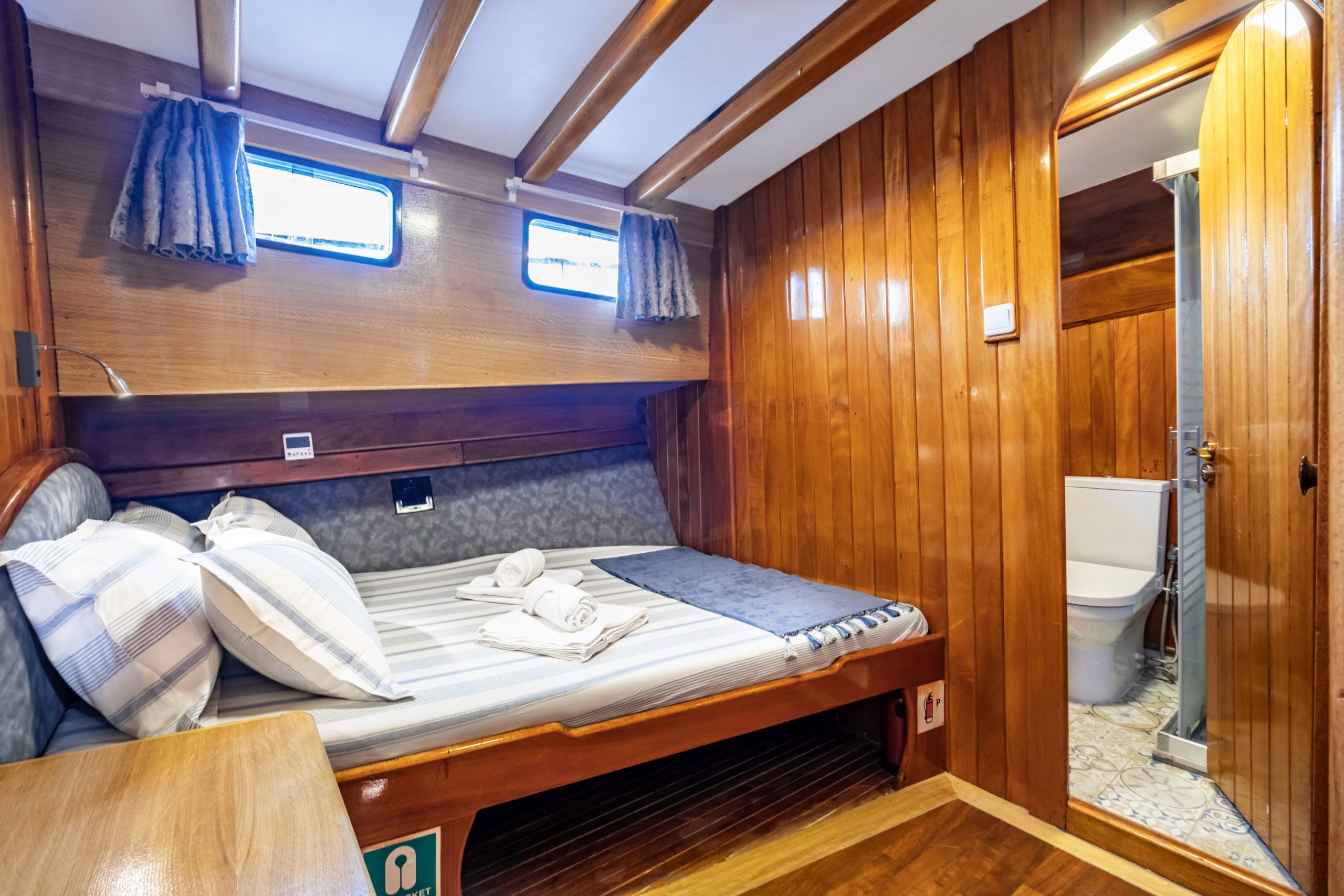 Deniz Kizi gulet is a 25-meter traditional gulet offering a comfortable sailing experience for up to 12 guests across its 6 cabins. Based in Bodrum, this gulet features 3 double cabins and 2 triple cabins as well as a large master cabin, each with ensuite facilities. Relax in the expansive outdoor saloon with plush cushioned seating, ideal for enjoying the shade and breathtaking views. The warm, inviting atmosphere makes it a perfect choice for families and groups seeking a memorable adventure in Gokova bay, Hiraronu or even Greek islands.