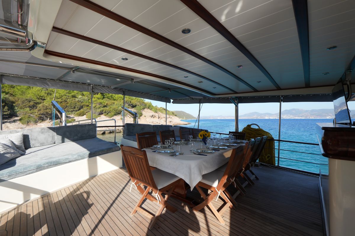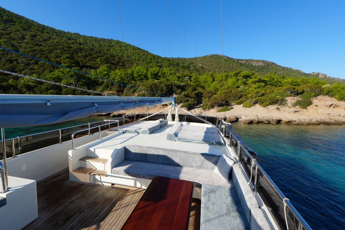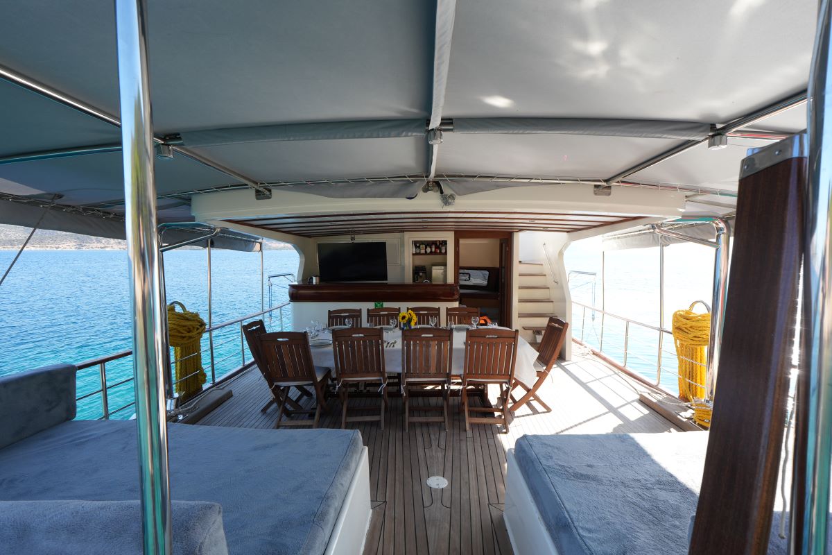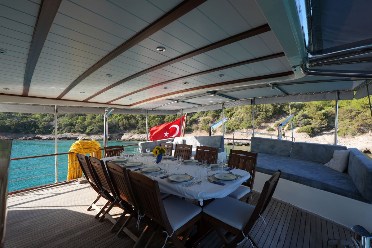 Ampi spazie esterni come il salone esterno con comode cusciniere sara perfetto per godervi il relax al l’ombra. Il flybridge sarà il posto preferito per gustare un aperitivo al tramonto. Con la sua atmosfera calda e invitante, il caicco Giulia è una scelta eccellente per famiglie e gruppi che cercano una crociera in caicco nuovo navigando nella baia di Gökova, Hisarönü o persino nelle isole greche.