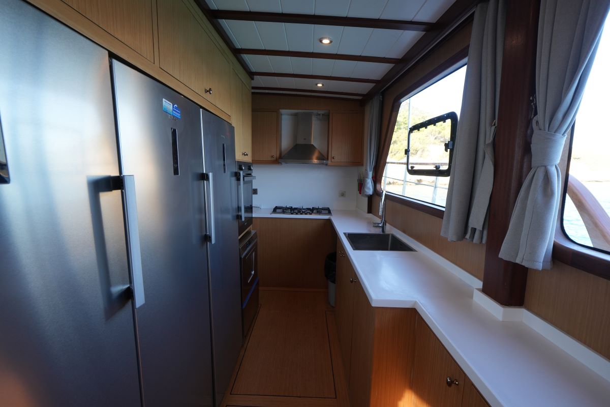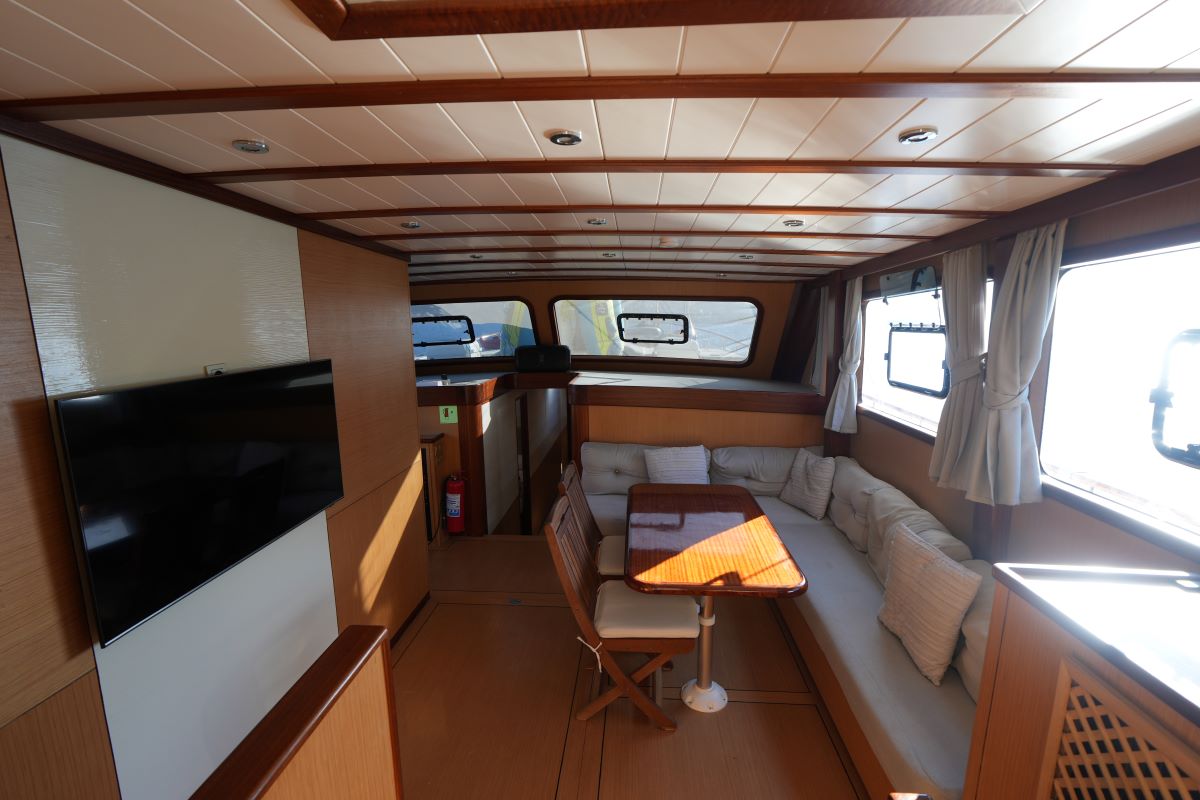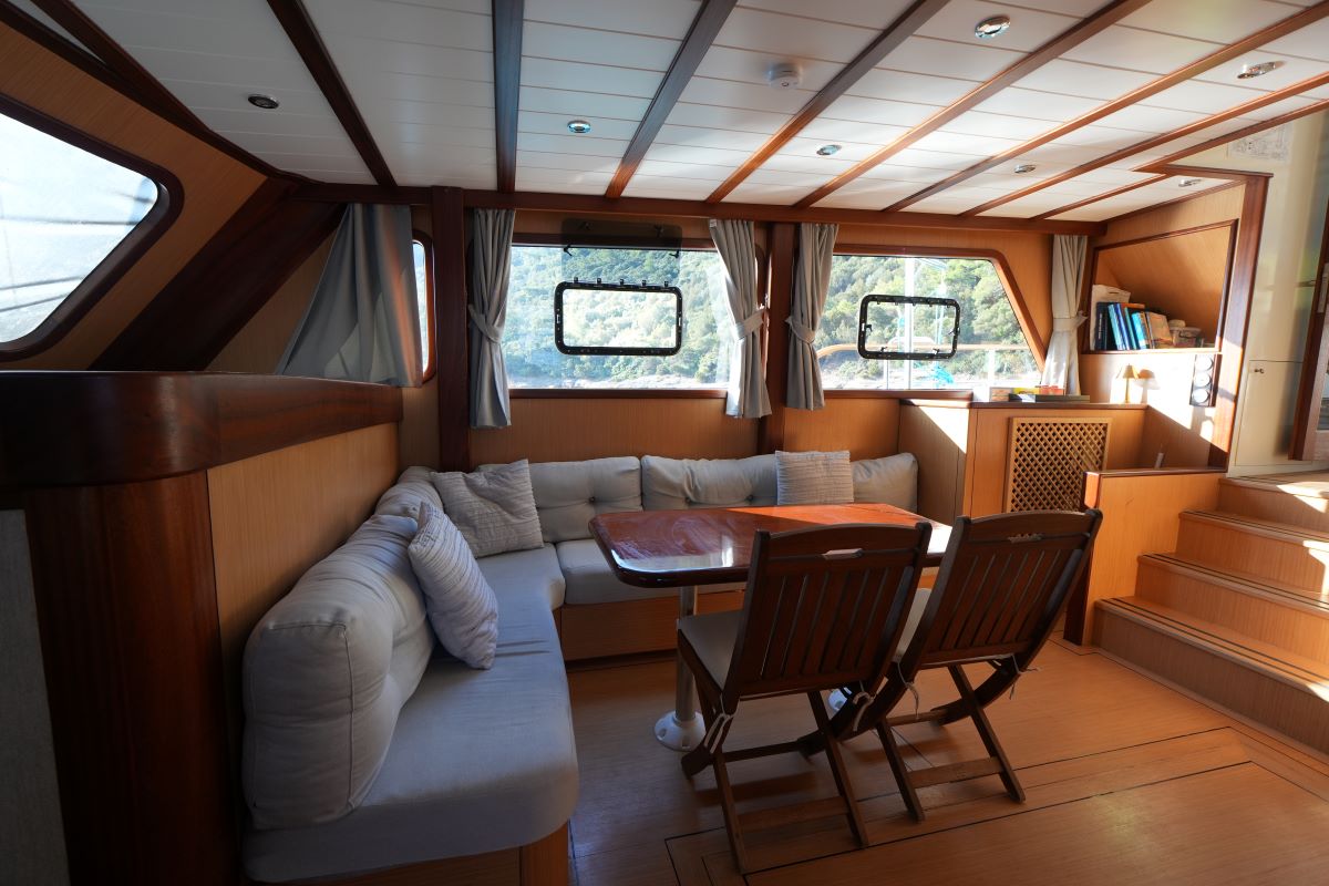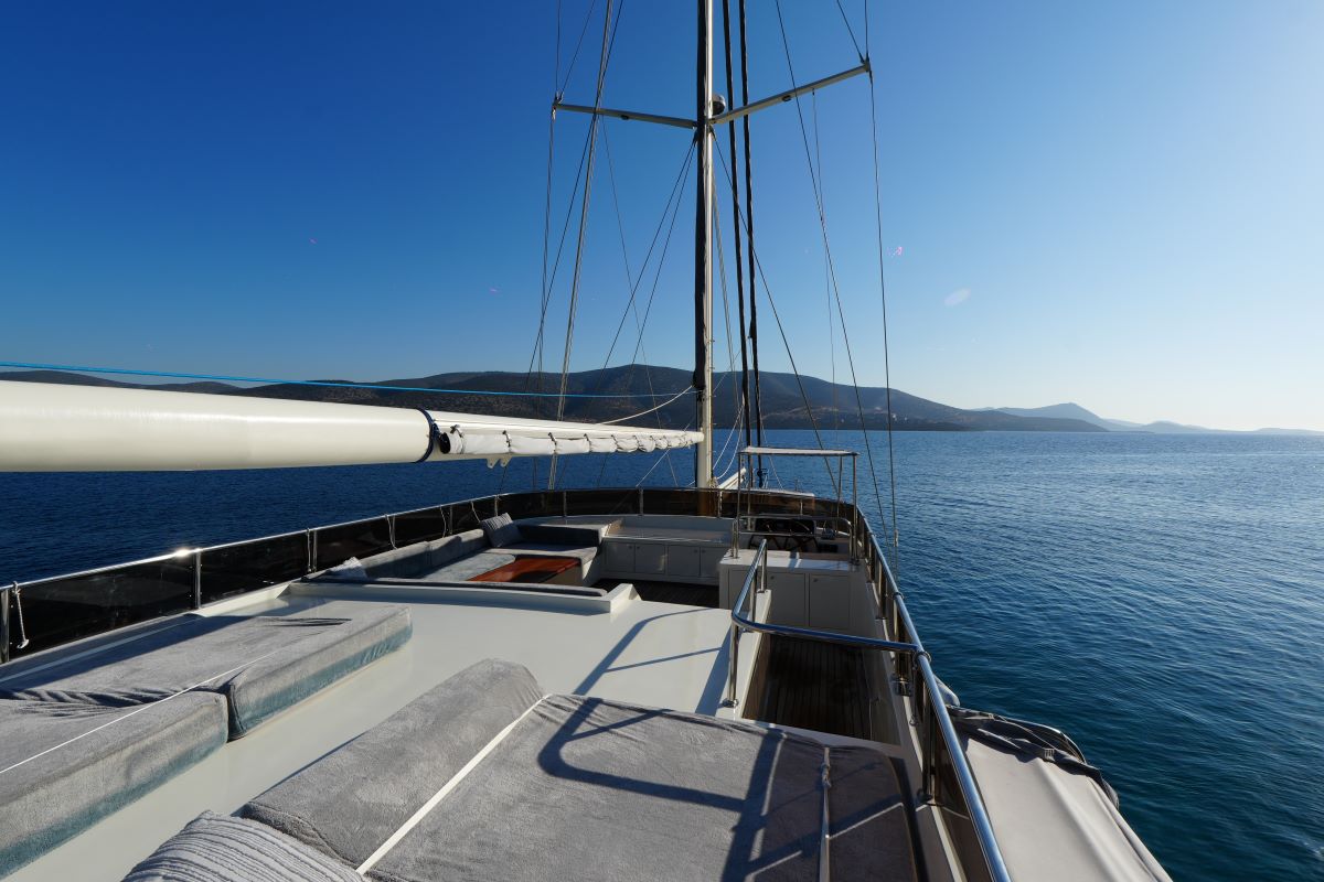 Ampi spazie esterni come il salone esterno con comode cusciniere sara perfetto per godervi il relax al l’ombra. Il flybridge sarà il posto preferito per gustare un aperitivo al tramonto. Con la sua atmosfera calda e invitante, il caicco Giulia è una scelta eccellente per famiglie e gruppi che cercano una crociera in caicco nuovo navigando nella baia di Gökova, Hisarönü o persino nelle isole greche.