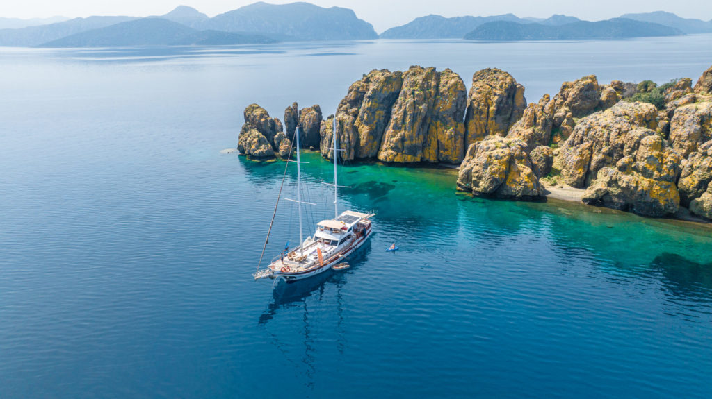 Next, let’s sail towards the Gocek Islands. Located near Fethiye, this archipelago is a sailor’s paradise. The region is known for its lush greenery, hidden coves, and quaint villages. Accordingly, the Gocek Islands offer a mix of tranquility and adventure. You can explore ancient ruins, indulge in local cuisine at waterside restaurants, or above all relax in a quiet bay.