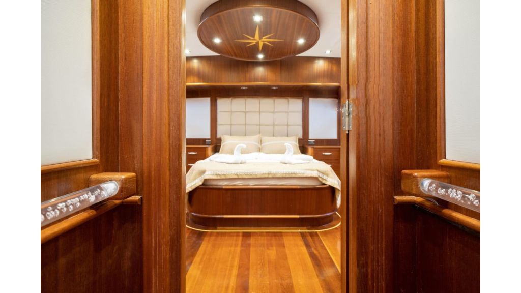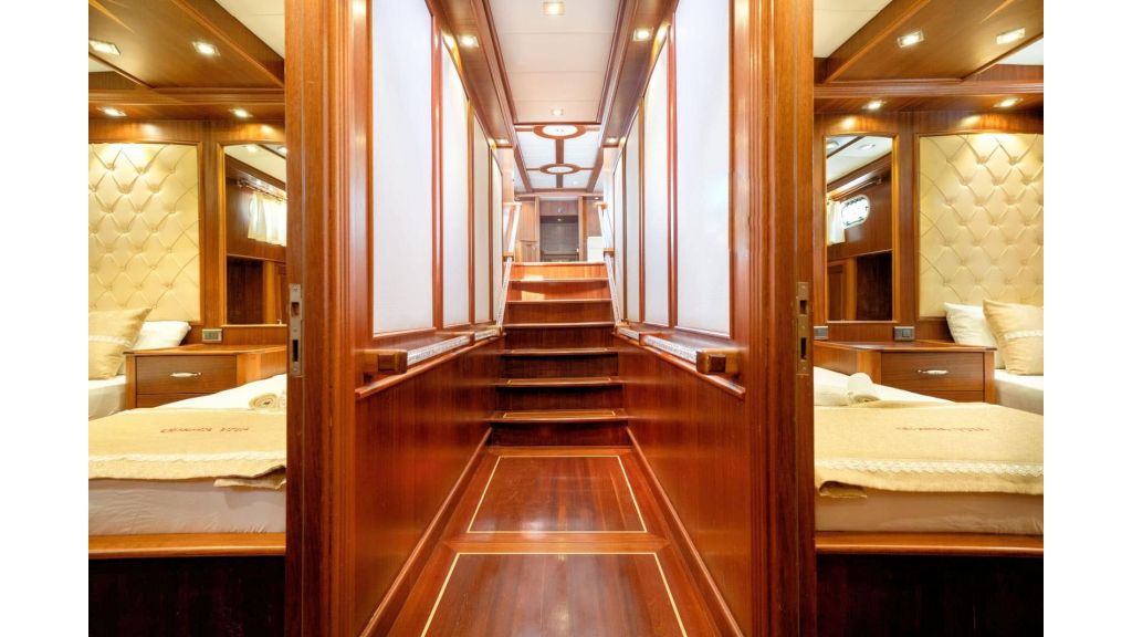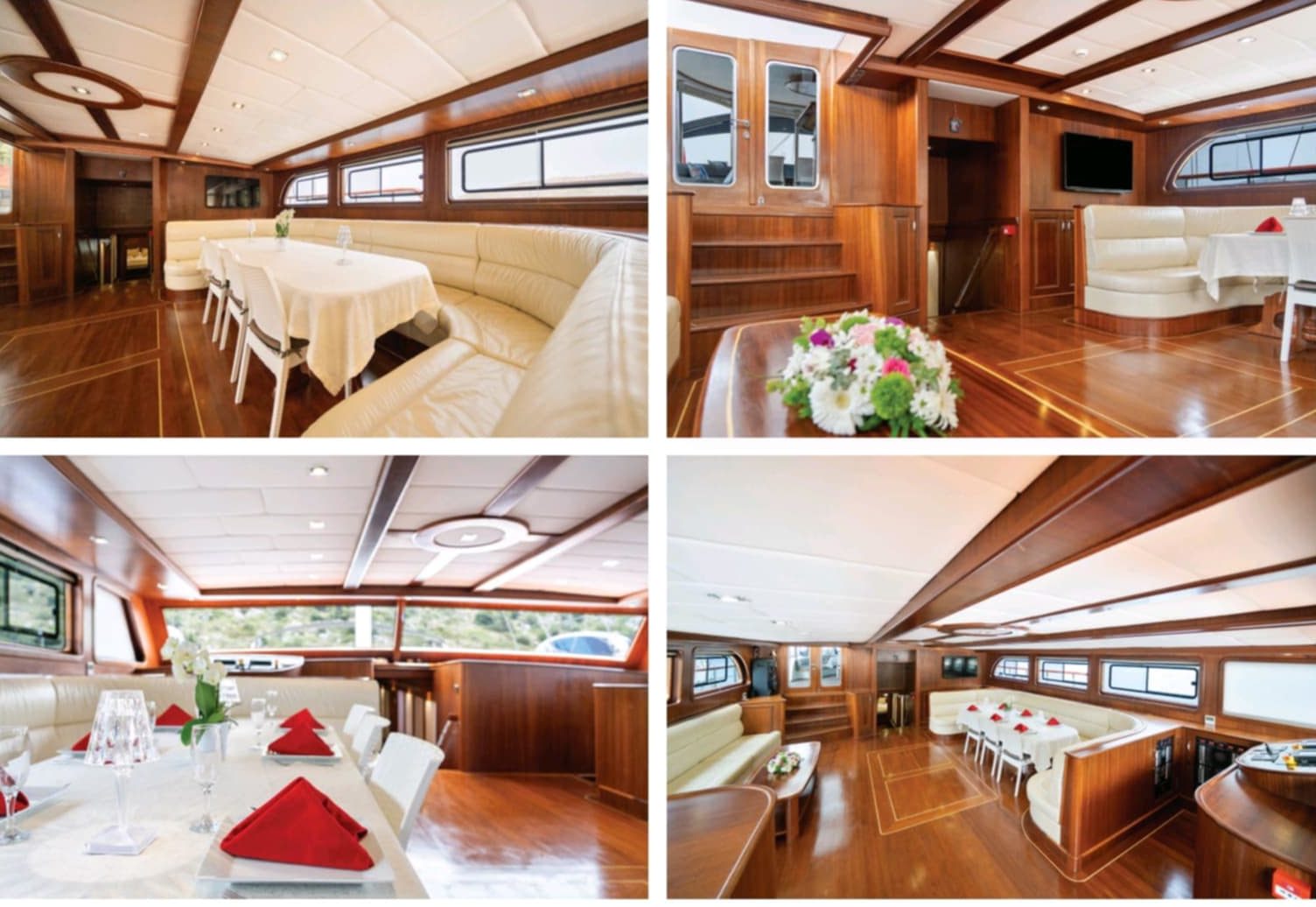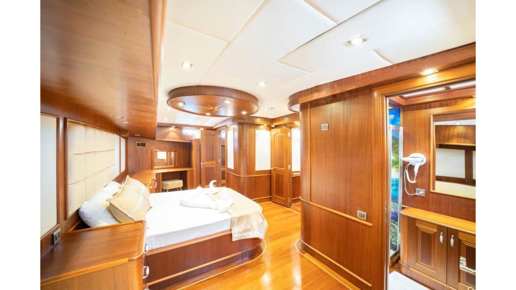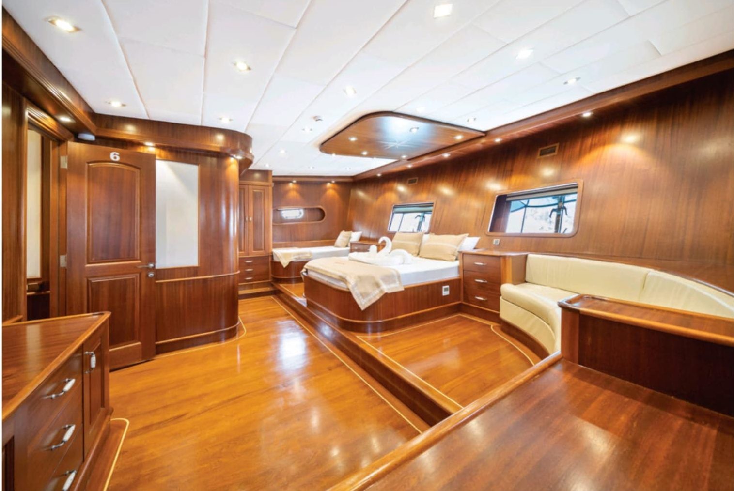 This elegant wooden gulet stretches approximately 34 meters in length and features 6 well-appointed cabins, accommodating up to 12 guests. Each cabin is equipped with air conditioning, a private en-suite bathroom, and refined furnishings to ensure maximum comfort and privacy throughout your voyage.