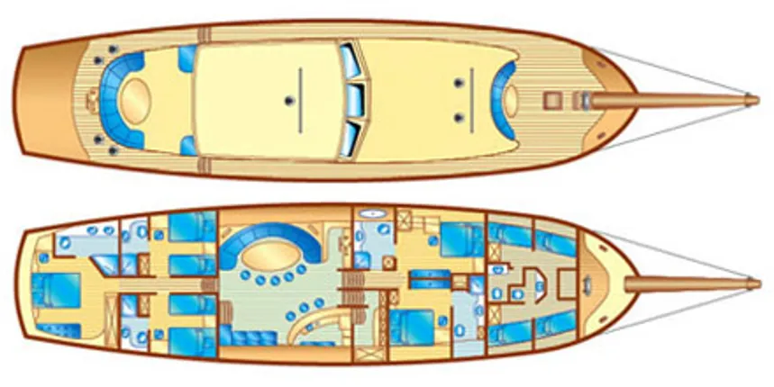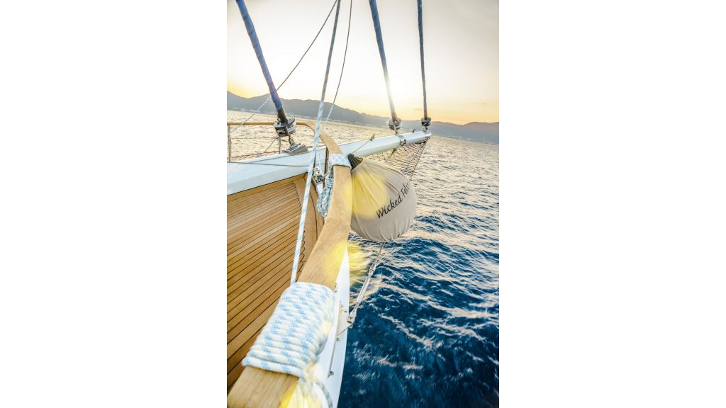Wicked Felina is a 34-meters very remarkable gulet with its traditional exterior design and elegant interior desig. Gulet Wicked Felina is offering a sophisticated and comfortable sailing experience for up to 10 guests across 5 stylish designed cabins. Refitted in 2017 and with her most recent renovations, the yacht features 1 master double cabin and 4 comfotable double cabins convertible, each with a private en suite bathroom. Fully air-conditioned, it includes a spacious inside and outside saloon with soft cushions on it, shaded deck for dining and relaxing and spacious sun deck . Guests can enjoy a variety of watersports, including paddle and canoeing or even jet ski, making it an excellent option for a memorable experience.